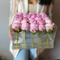 Композиция из 17 розовых пионов в розовой шляпной коробке