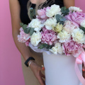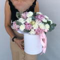 Цветочная композиция из розовых роз, розовых эустом и белых альстромерий в шляпной коробке