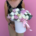 Цветочная композиция из розовых гортензий, малиновых кустовых роз, розовых орхидей и маттиол в розовой шляпной коробке