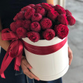 Композиция из роз, эустомы, диантуса и других цветов в бордовой шляпной коробке