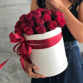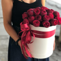 Цветочная композиция из 15 малиновых роз в красной шляпной коробке