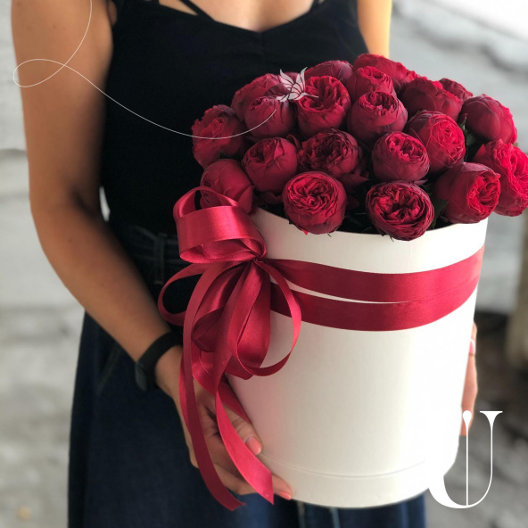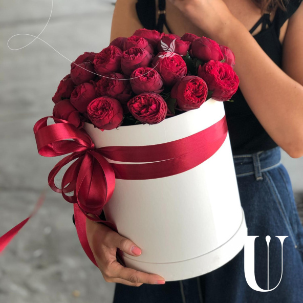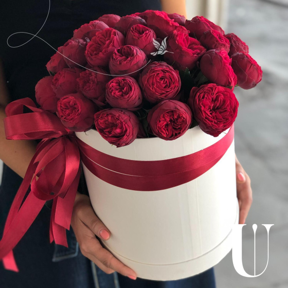 Композиция из 9 пионов Сара Бернар в шляпной коробке