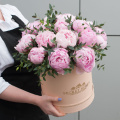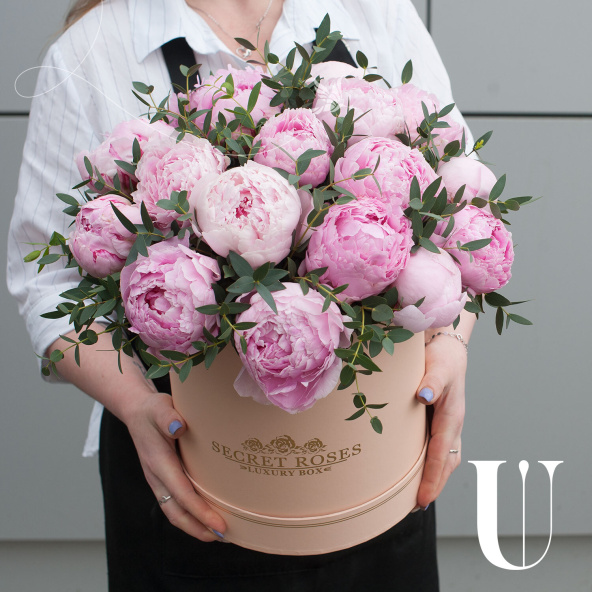 Коробка из розовых пионов с эвкалиптом "Милое создание" - это изысканный и стильный подарок, который подойдет для любого повода.