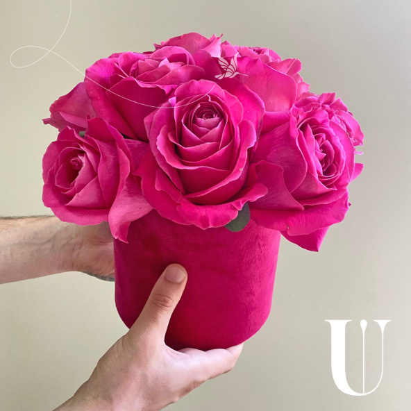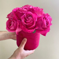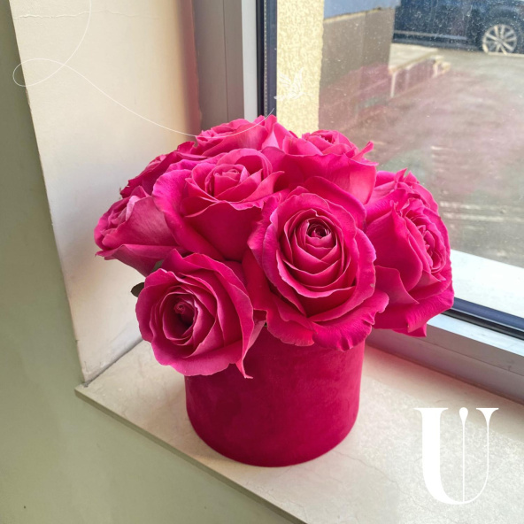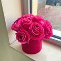 Цветочная композиция из кремовых роз в розовой шляпной коробке