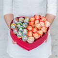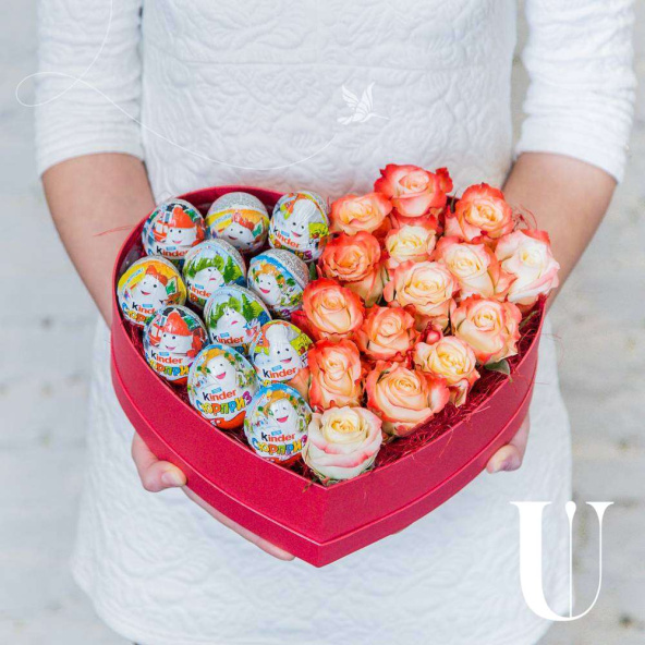 Композиция из розовых кустовых роз и шоколадных букв в коробке формы сердца