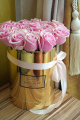 Композиция из 39 диантусов розовых оттенков в бежевой шляпной коробке