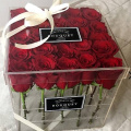 Красные розы Эксплорер в светло-голубой шляпной коробке