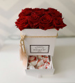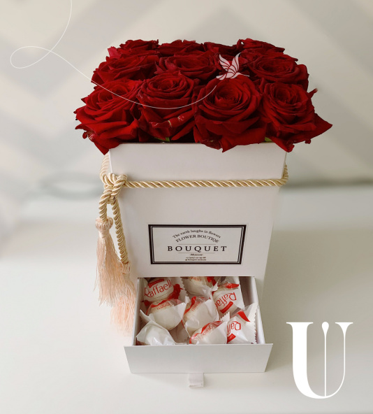 15 красных роз в шляпной коробке с ящиком и конфетами Рафаелло