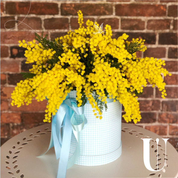 Композиция из белой гипсофилы и ночника в шляпной коробке