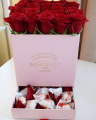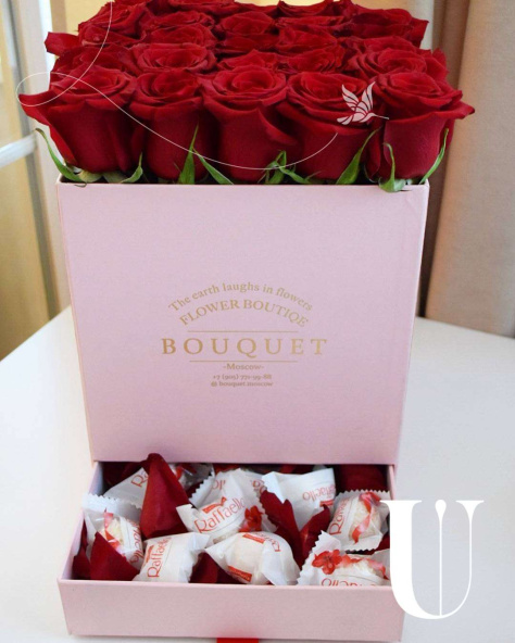 Коробка с ящиком. 25 алых роз и конфеты рафаелло