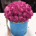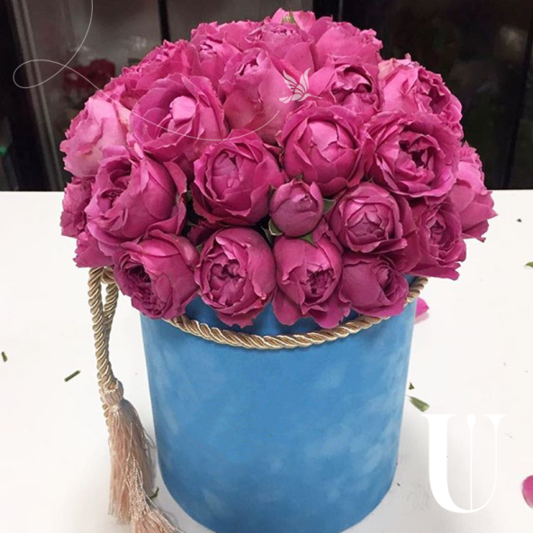 Голубая бархатная коробка 16 на 20 см. с пионовидными кустовыми розами Мисти Баблс 19 стеблей, флористическая губка - 1 штука