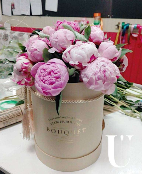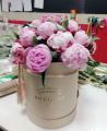 - 19 идеальных зимних пионов сорта Сара Бернар в большой шляпной коробке перевязанной шнуром с кистями или атласной лентой