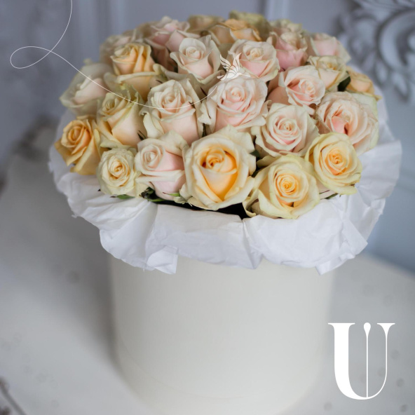 - Цветочная композиция в шляпной коробке. В составе роза Талея 29шт. Композиция собрана в специальной флористической губке