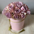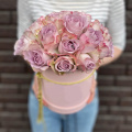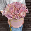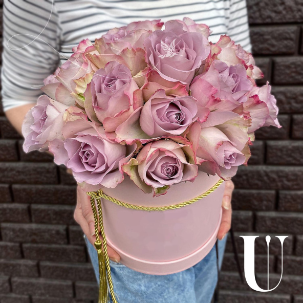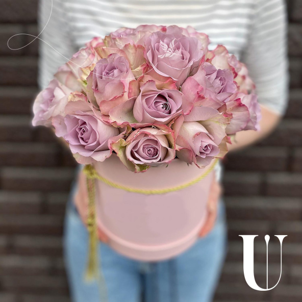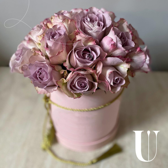 19 роз лавандового цвета в нежной розовой коробочке размером 16х18 см., перевязанной шнуром с кистями