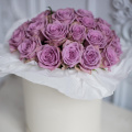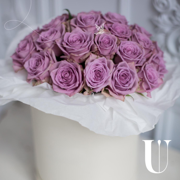 Цветочная композиция в шляпной коробке. В составе роза 29шт. Композиция собрана в специальной флористической губке, легка в уходе. Не требует вазы. Размер самой коробки 20*25см.