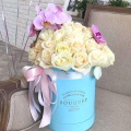 Композиция из 45 роз сорта Аква в шляпной коробке