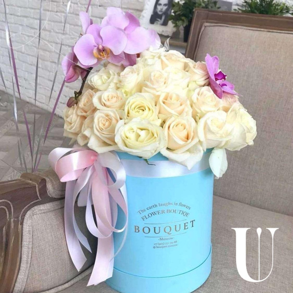 Композиция из роз, эустомы и других цветов в шляпной коробке