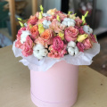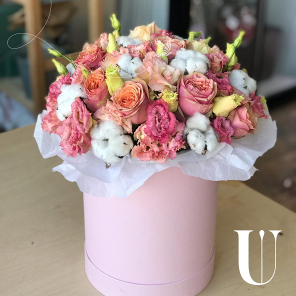 - Цветочная композиция в шляпной коробке. В составе эустома