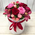 - Мы собрали в этой стильной шляпке самые красивые цветы: орхидеи и микс разнофактурных роз! Цветы внутри находятся в воде