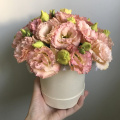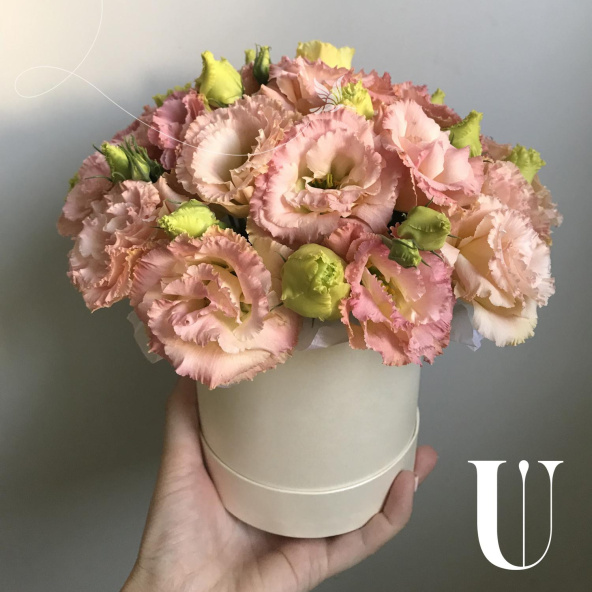 - Цветочная композиция в шляпной коробке. В составе эустома. Композиция собрана в специальной флористической губке