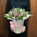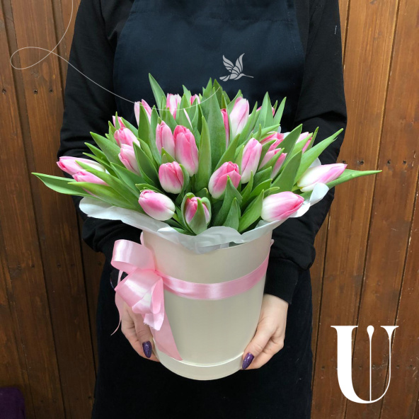 Цветочная композиция из кремовых роз в розовой шляпной коробке