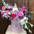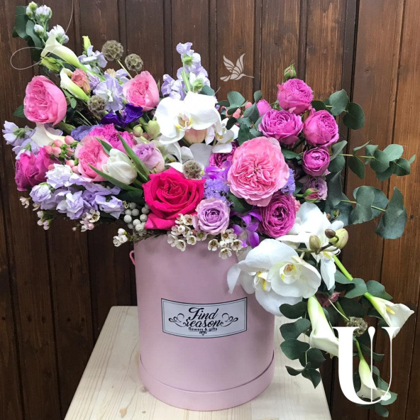 - Шляпная коробка нежно-розовая на биофлоре 16 см диаметр