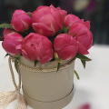 Композиция из 7 розовых пионов в белой шляпной коробке