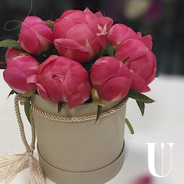 9 пионов сорта Корал Шарм в бежевой шляпной коробке 16 на 20 см., флористическая губка - 1 шт.