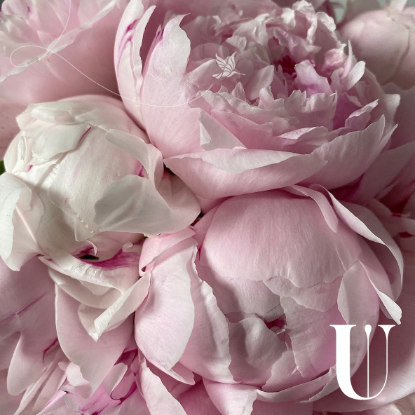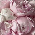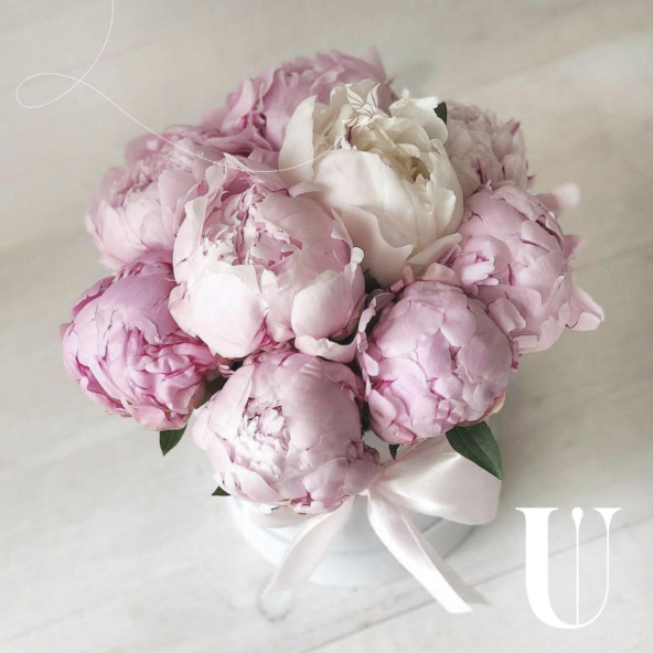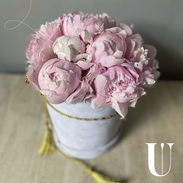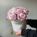 9 пионов Сара Бернар в белой коробке 16 на 20 см., флористическая губка - 1 шт.