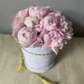 Композиция из розовых кустовых роз в розовой шляпной коробке