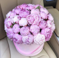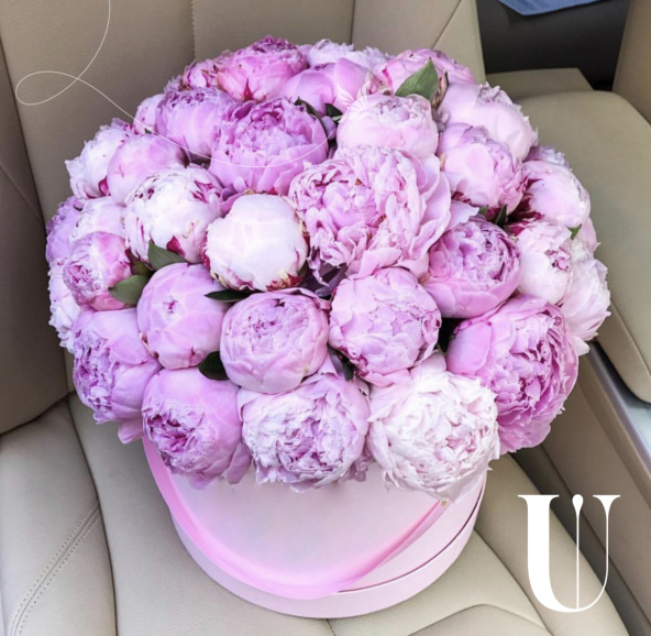 49 тюльпанов сорта Сара Бернар в розовой коробке 30 на 18 см., флористическая губка - 1 шт.