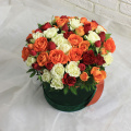 9 желтых роз и кустовые оранжевые розы в шляпной коробке
