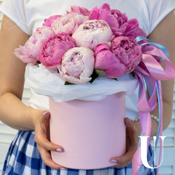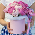 7 нежно-розовых пионов Сара Бернар в шляпной коробке