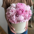 Мини-композиция из 7 пионов сорта Сара Бернар в белой шляпной коробке