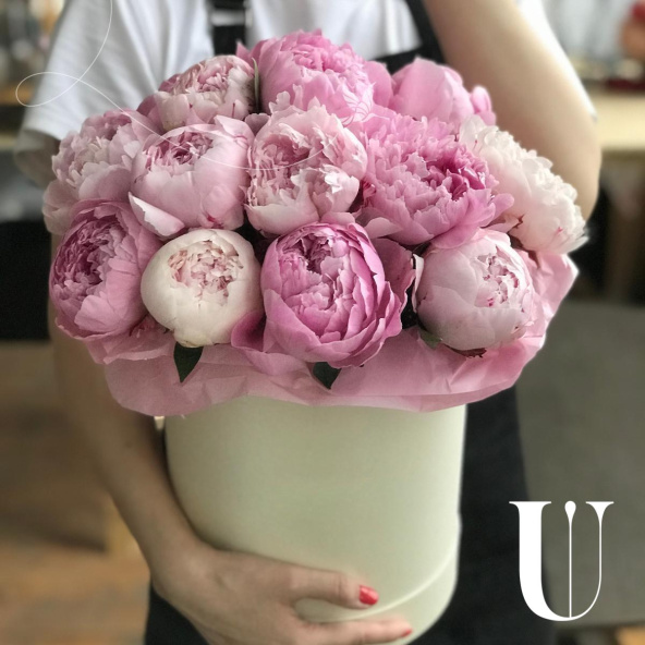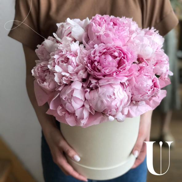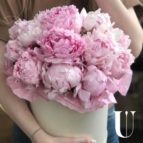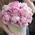 7 нежно-розовых пионов Сара Бернар в шляпной коробке
