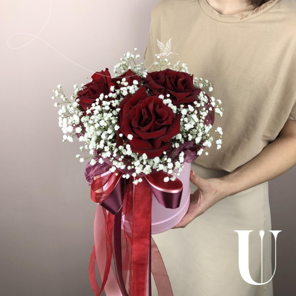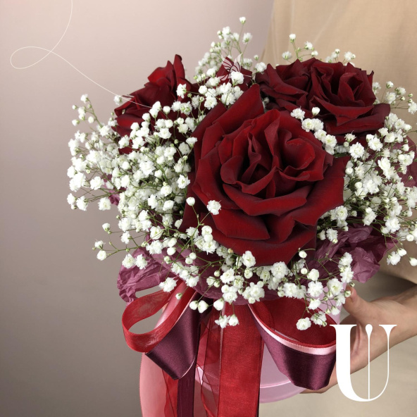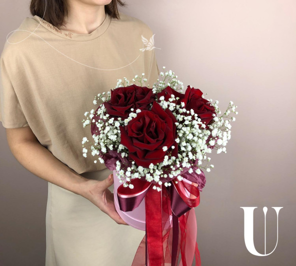 Нежная дизайнерская композиция из роз, гвоздик и гортензии в шляпной коробке