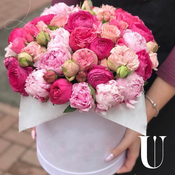- 9 классических нежно розовых роз в белой шляпной коробке размером 20 на 25 см