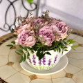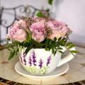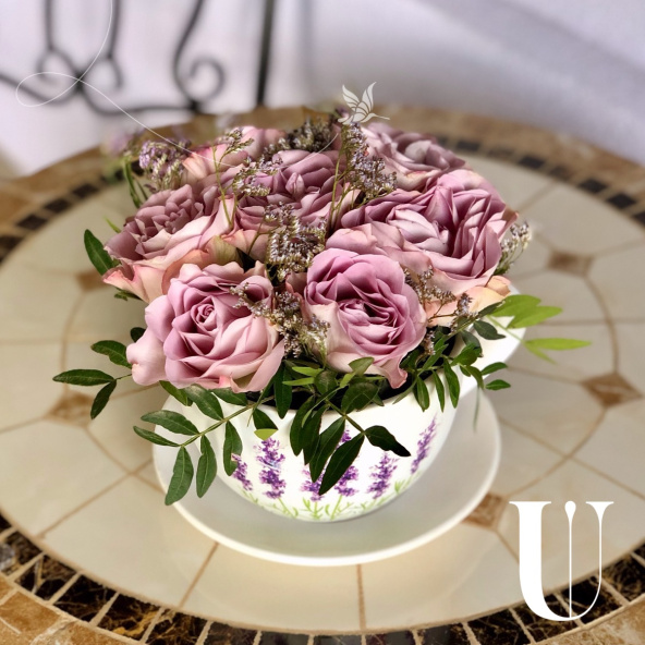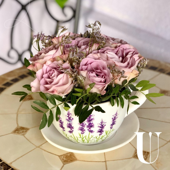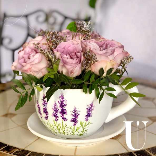 Композиция лавандовых роз и лимониума в керамическом кашпо в форме кружки