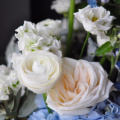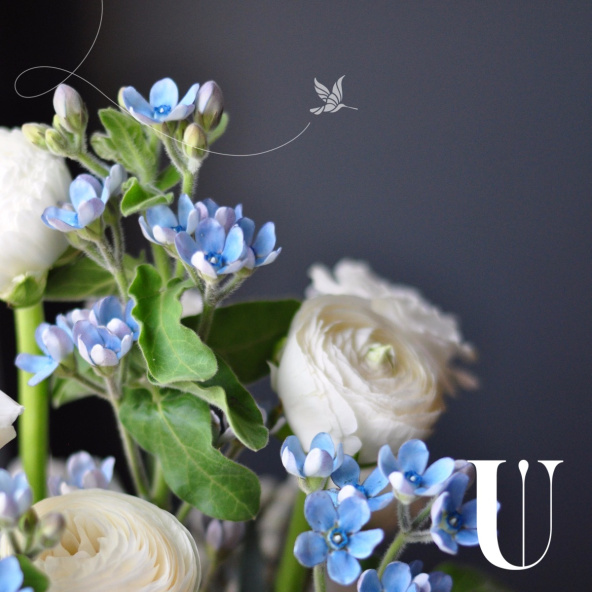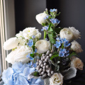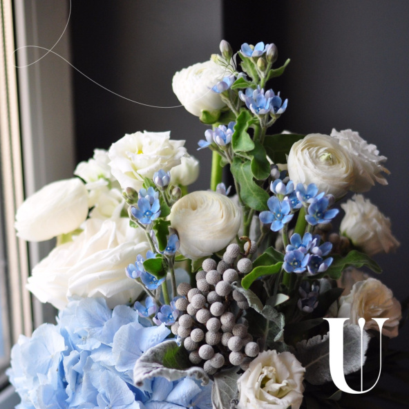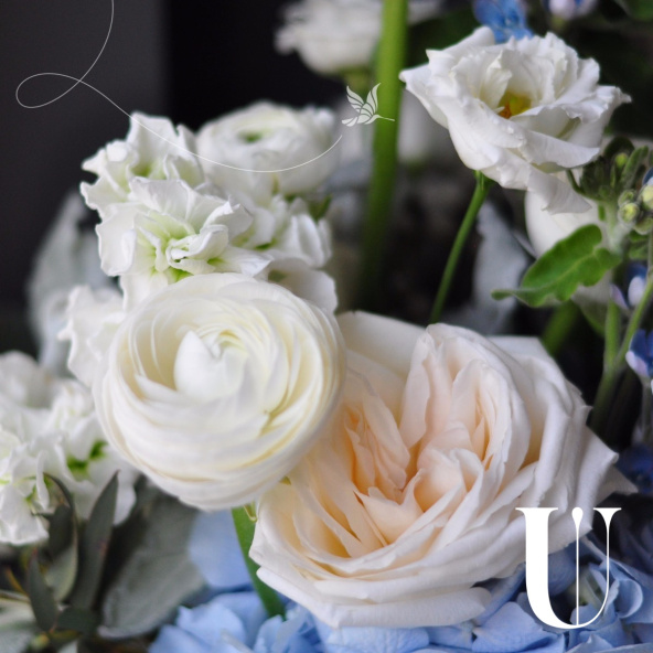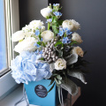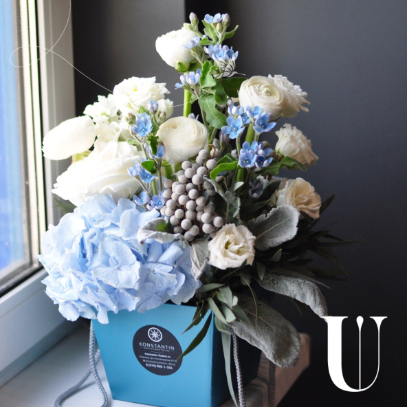 - Оксипеталум голубой -3 шт. бруния -2 шт. ранункулюс -3 шт. гортензия голубая -1 шт. эустома белая-2 шт. роза пионовидная -3шт. эвкалипт -1 шт. сенецио -2 шт. коробка дизайнерская -1 шт. губка флористическая-1 шт