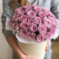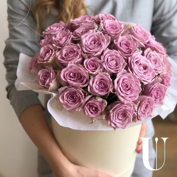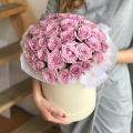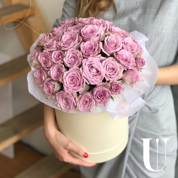 Цветочная композиция в шляпной коробке. В составе роза 29шт. Композиция собрана в специальной флористической губке, легка в уходе. Не требует вазы. Размер самой коробки 20*20см