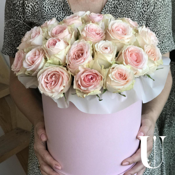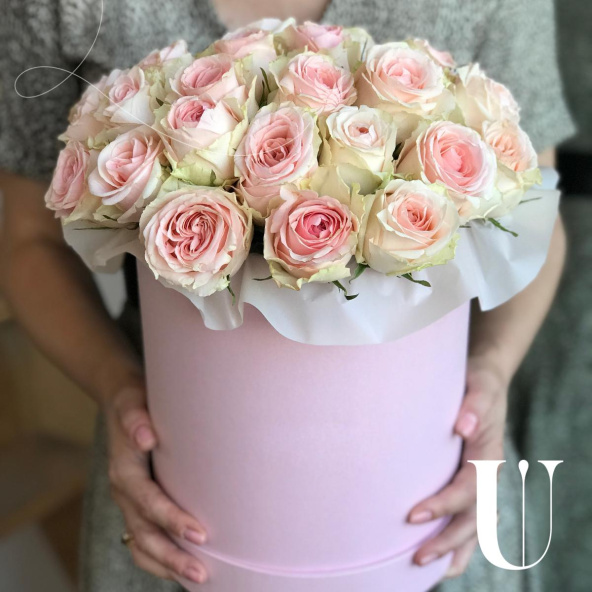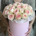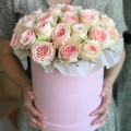 Цветочная композиция в шляпной коробке. В составе роза нежно-розовая 29шт. Композиция собрана в специальной флористической губке, легка в уходе. Не требует вазы. Размер самой коробки 20*25см