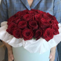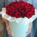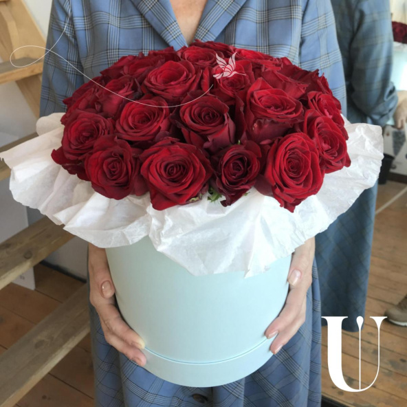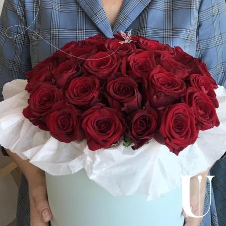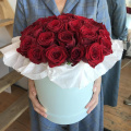 Цветочная композиция в шляпной коробке. В составе роза гран при 29 шт. Композиция собрана в специальной флористической губке, легка в уходе. Не требует вазы. Размер самой коробки 20*20см