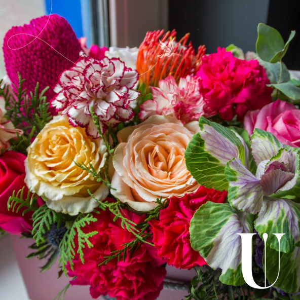 Брассика - 2шт, эвкалипт - 3 шт, эрингиум - 4 шт, диантус сортовой - 13 шт, роза эквадор - 5 шт, леокосперум - 1 шт, банксия - 1 шт, эустома - 3 шт, пшеница (сухоцвет) - 2 шт, ветки ели - 1 шт