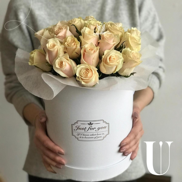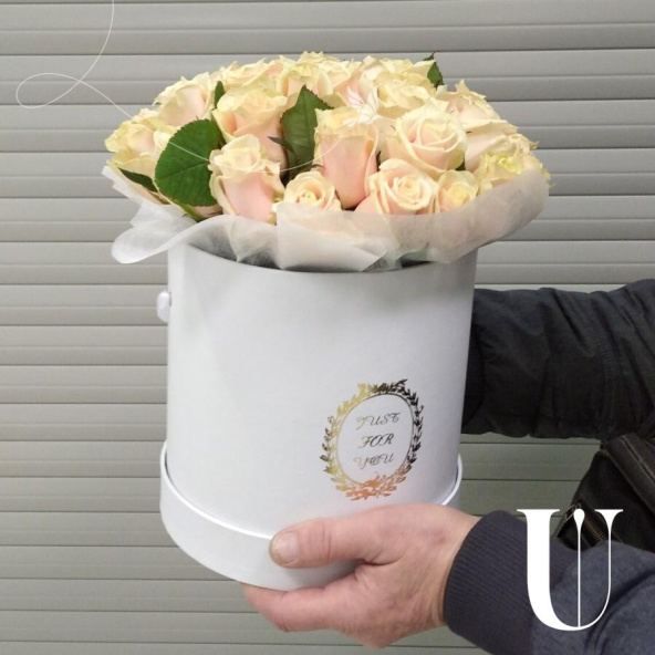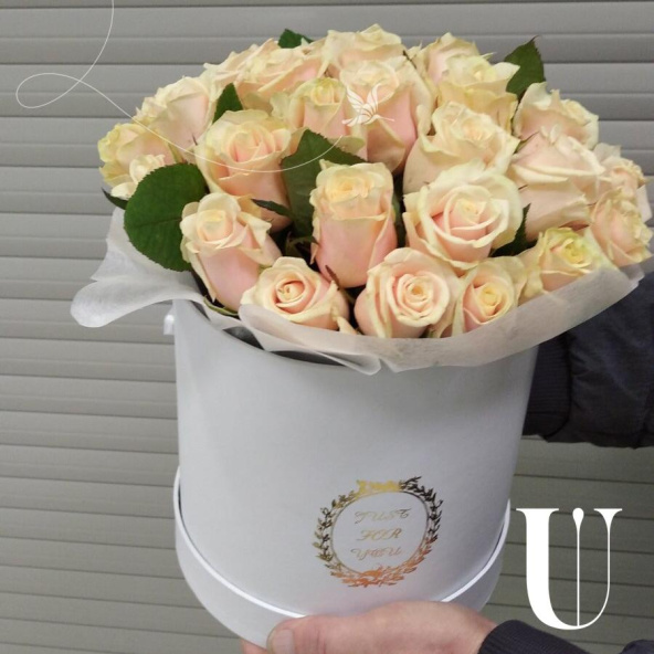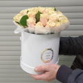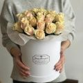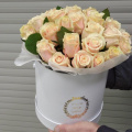 Цветочная композиция в шляпной коробке. В составе роза кремовая 29 шт. Композиция собрана в специальной флористической губке, легка в уходе. Не требует вазы. Размер самой коробки 20*20см