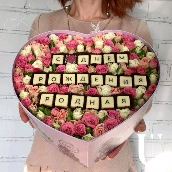 Кустовые розы, макаруни и шоколадные буквы в коробке формы сердца
