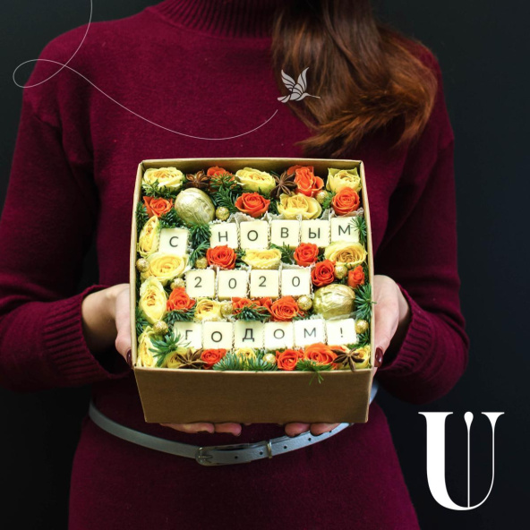 Буквы «С Новым Годом!», розы кустовые микс, новогодний декор, оазис, подарочная коробка с крышкой. ( Декор может незначительно отличаться с сохранением цветовой гаммы.)