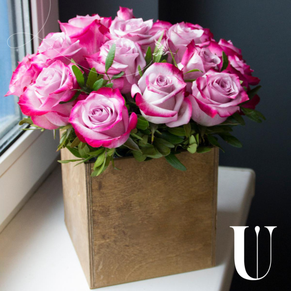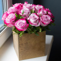 Цветочная композиция из кремовых роз в розовой шляпной коробке