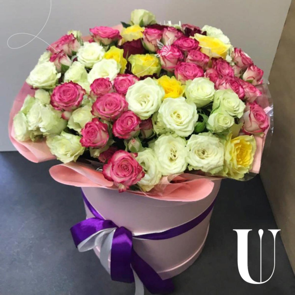 Яркая коробка из цветных кустовых роз 29 шт
