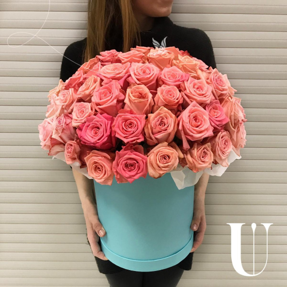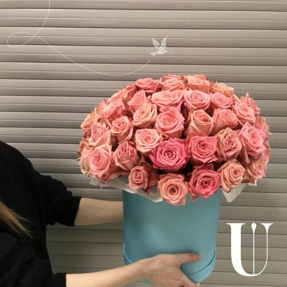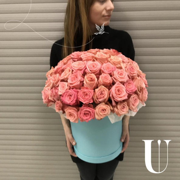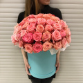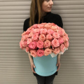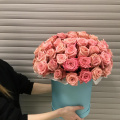 - Цветочная композиция в шляпной коробке. В составе роза 65 шт. Композиция собрана в специальной флористической губке
