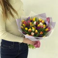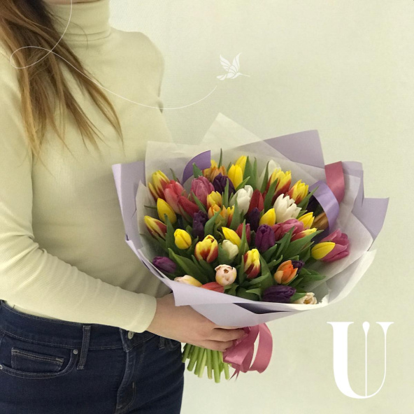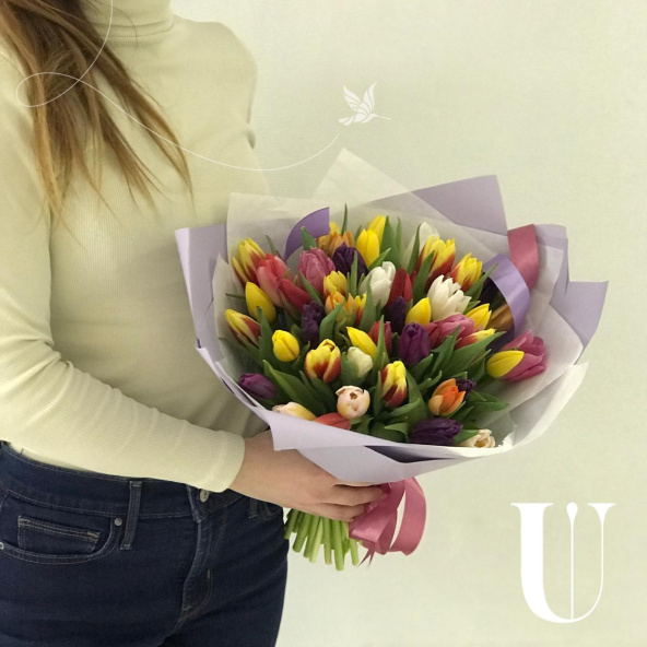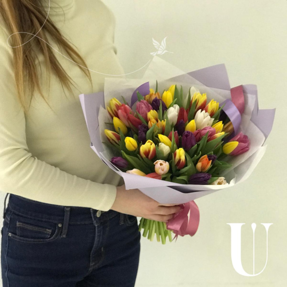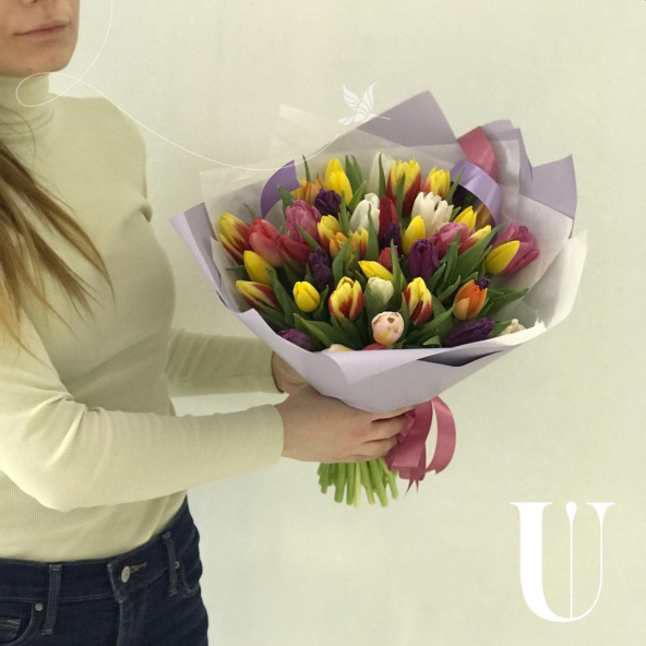 - Букет из цветных тюльпанов 49 шт. Букет упакован в крафт бумагу и перевязан атласными лентами. По вашему желанию мы можем изменить упаковку